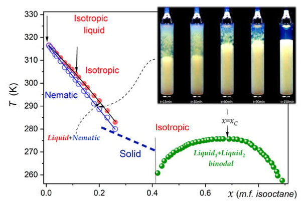The report presents studies in 4′-methoxybenzylidene-4-n-butylaniline (MBBA) and isooctane (Sol) mixtures, for which the monotectic-type phase diagram was found. There are two biphasic regions (i) for the low (TP1), and (ii) high (TP2) concentrations of isooctane. For both domains, biphasic coexistence curves’ have been discussed and parameterized. For TP2 it is related to the order parameter and diameter tests. Notable is the anomalous mean-field type behavior near the critical consolute temperature. Regarding the isotropic liquid phase, critical opalescence has been detected above both biphasic regions. For TP2 it starts ca. 20 K above the critical consolute temperature. It is classic (mean-field) above TP1 and non-classic above the TP2 domain. The long-standing problem regarding the non-critical background effect was solved to reach this resultS.